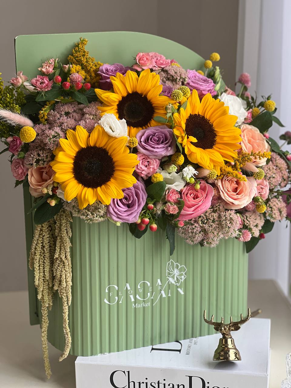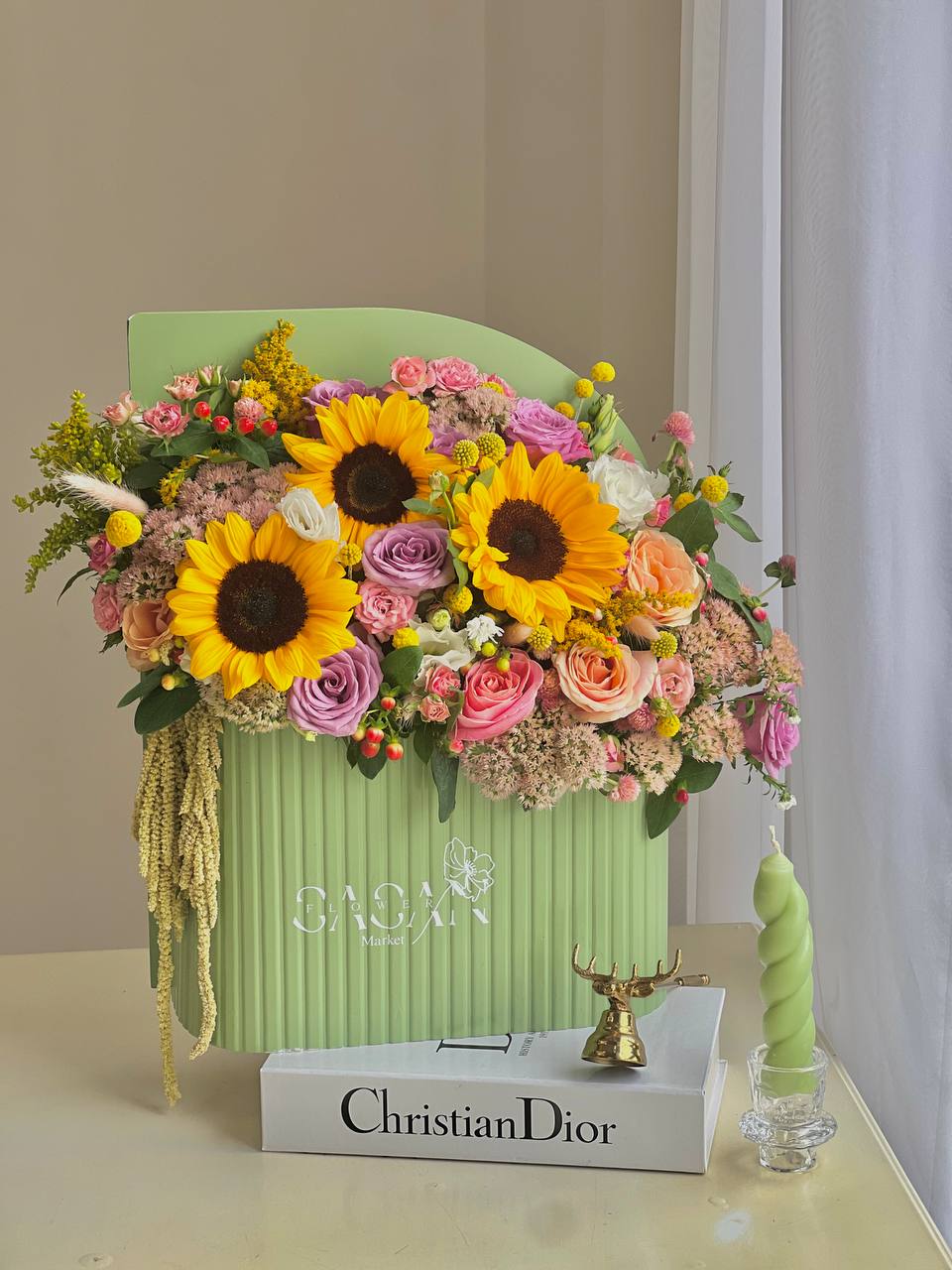 ⚠️در محصولات سفارشی،محصول ۸۰ درصد مشابه عکس فوق خواهد بود و اندکی تغییر با توجه به موجودی گل روز و …امکانپذیر است.